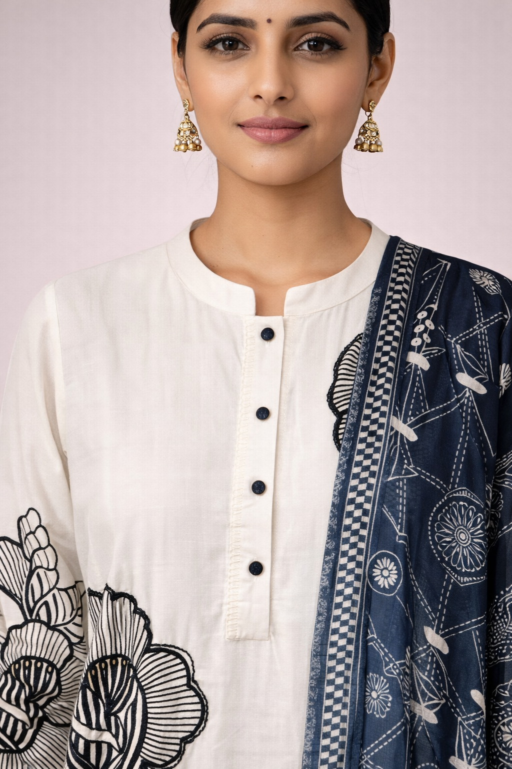Completing the outfit is a navy blue printed dupatta with traditional motifs, creating a striking contrast with the white kurta and elevating the overall ethnic appeal.