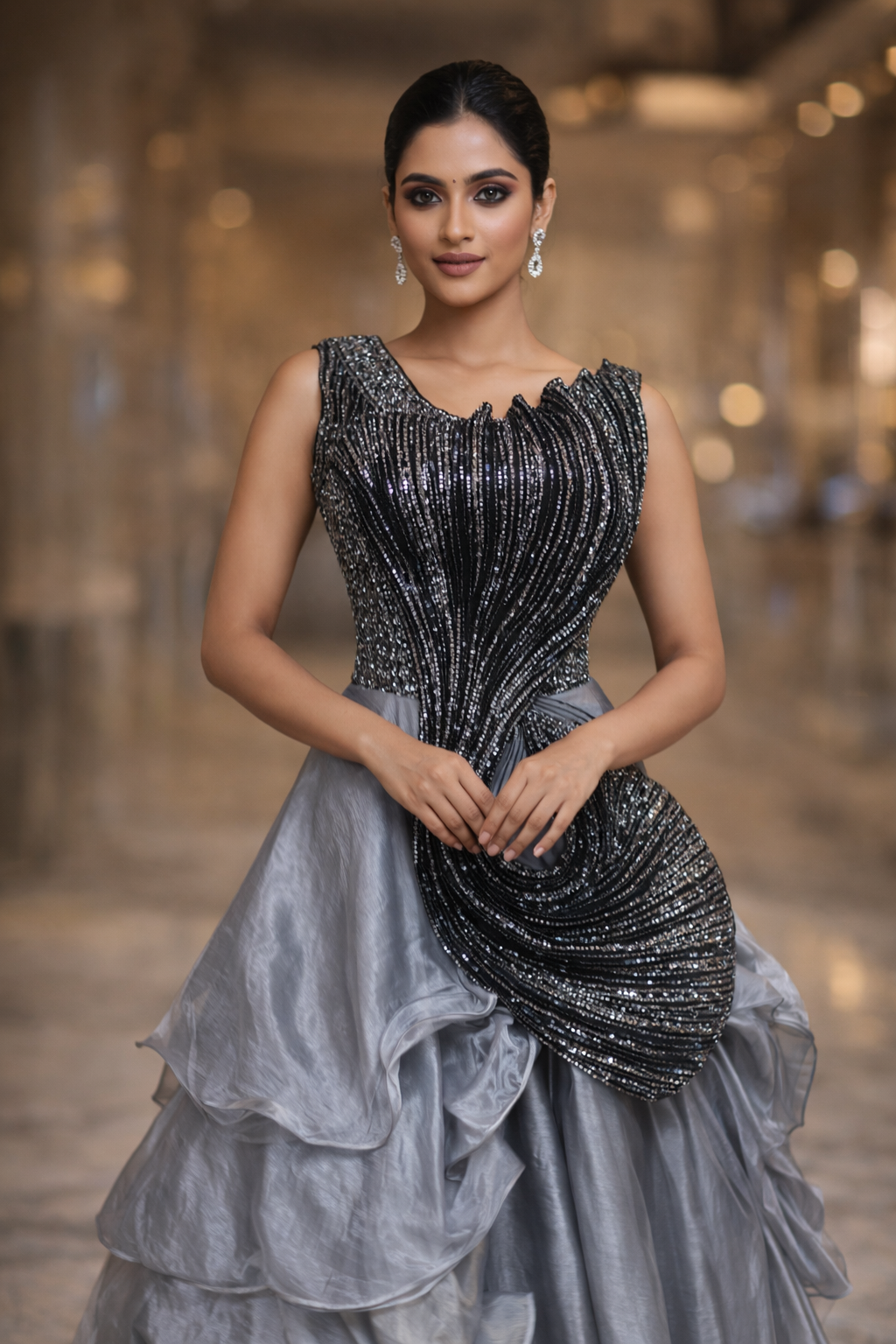 Make a bold statement with this black sequin party gown for women, designed to deliver effortless glamour for evening and cocktail occasions. Crafted with a shimmering sequin-embellished bodice and a flowing layered organza skirt, this gown offers a perfect balance of elegance and modern style. The sculpted silhouette enhances the fit, while the soft flare adds graceful movement—ideal for parties, receptions, and special events.