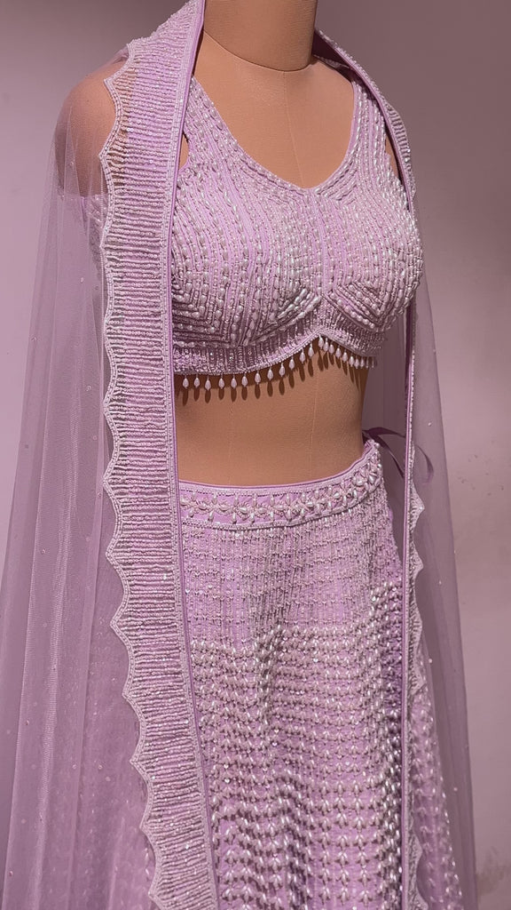 This exquisite lavender raw silk lehenga set is a perfect blend of modern elegance and handcrafted luxury. The sleeveless blouse features intricate bead, sequin, and thread embroidery with a delicate scalloped hemline, creating a refined silhouette. The lehenga skirt is adorned with fine vertical embellishments that add texture, flow, and subtle shimmer.